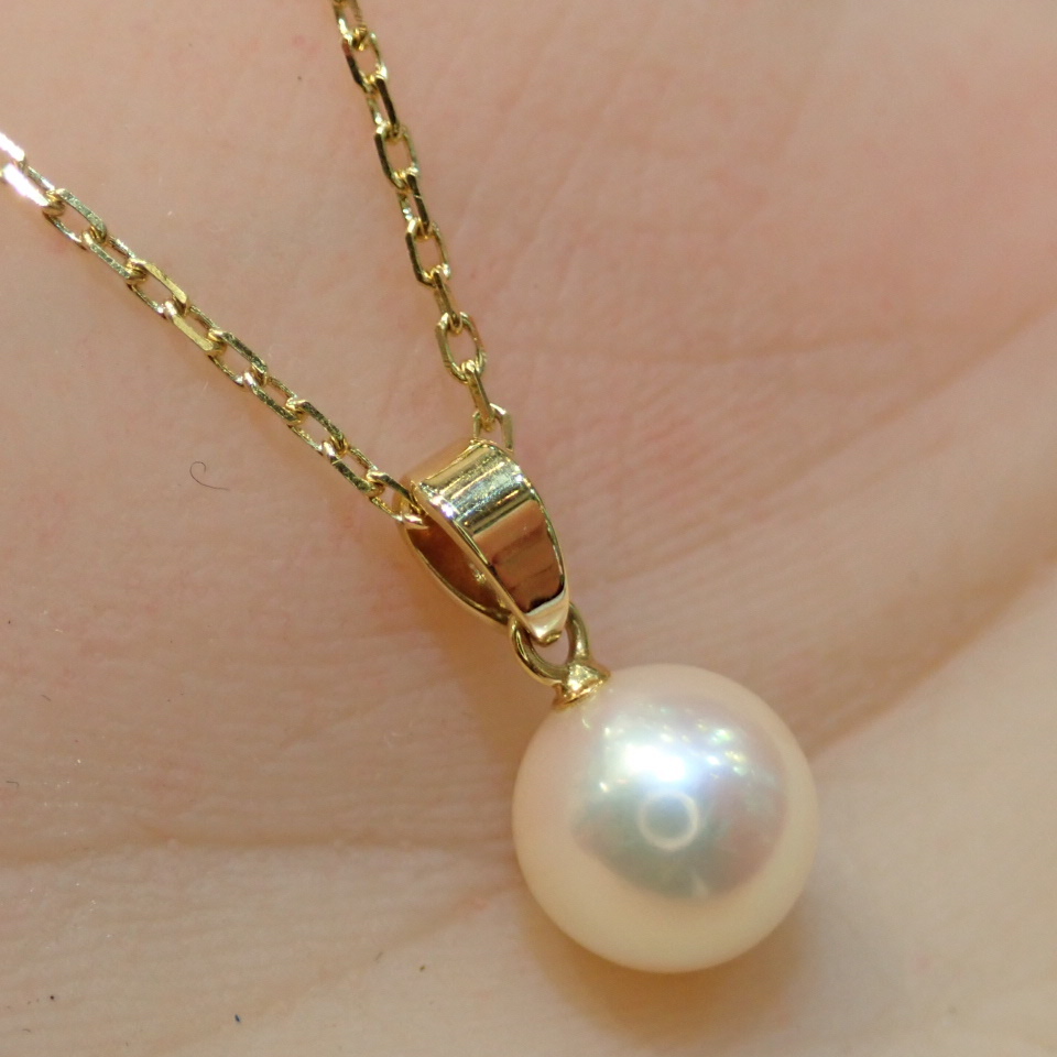 - ■K18YG ミキモト アコヤ真珠ペンダントネックレス 約7.6mm■MIKIMOTO■あこや本真珠 パール■カット角小豆■中古磨き仕上げ■