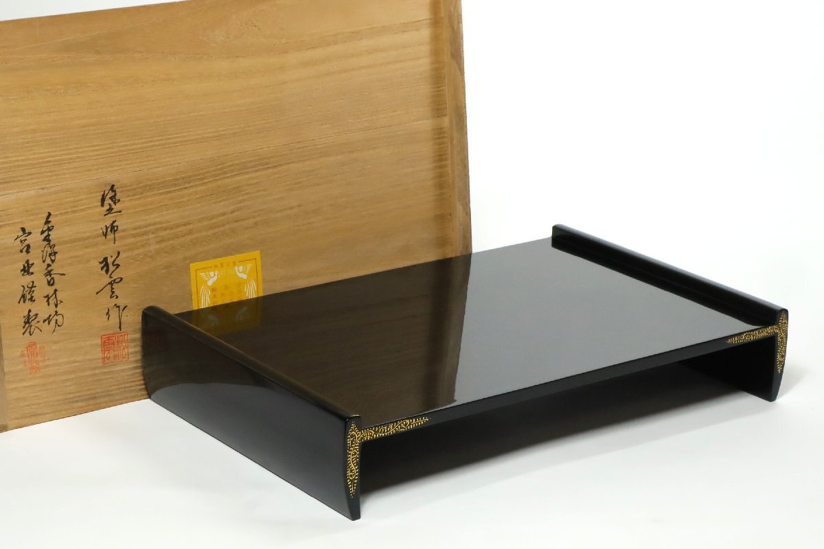 輪島塗 塗師松雲 金沢香林坊宮北謹製 卓 黒塗縁沈金二枚足 共箱 /置物台 飾台 置台
