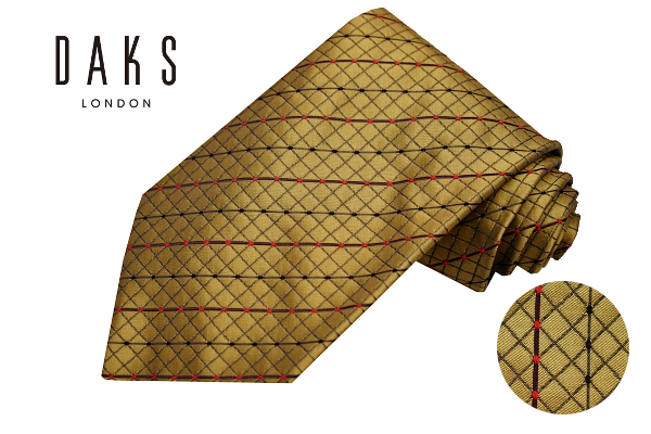 > N-3018★送料無料★超美品★DAKS LONDON ダックス ロンドン★フランス製 ゴールド系 レジメンタル チェック柄 織り生地光沢 シルクネクタイ