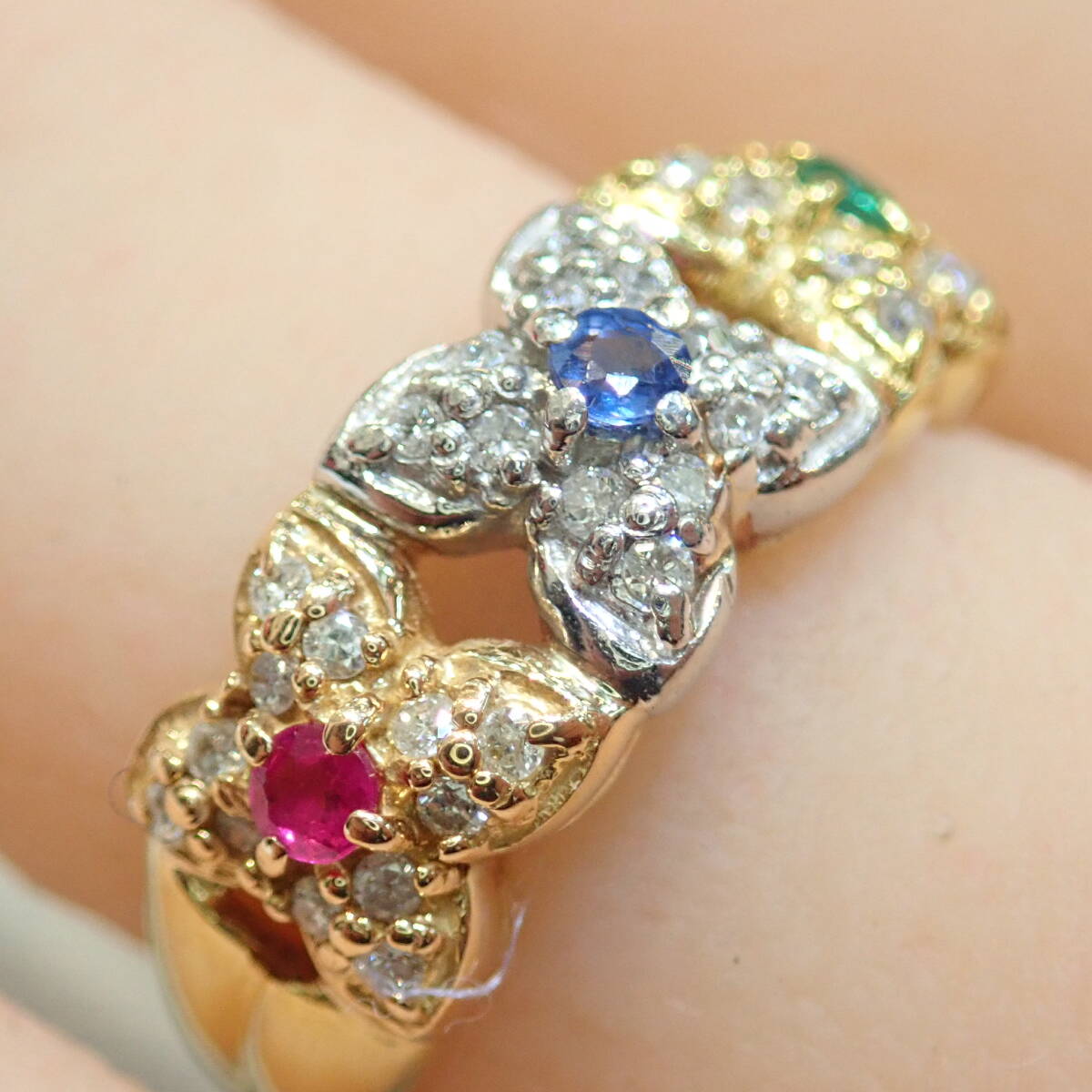 > ■K18YG/Pt900/K18PG エメラルド×サファイア×ルビー×ダイヤモンド マルチカラーリング■ボリューム■指輪■中古磨き仕上げ■
