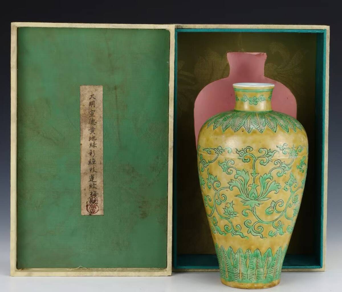 > 磁器 花瓶 秘藏 大明宣徳年制 黄地緑彩絡枝蓮紋梅瓶 酒器 茶器 唐磁 染付 陶磁器 收蔵品 古美味 時代物 古美術 古置物 珍品 中國文玩6.22