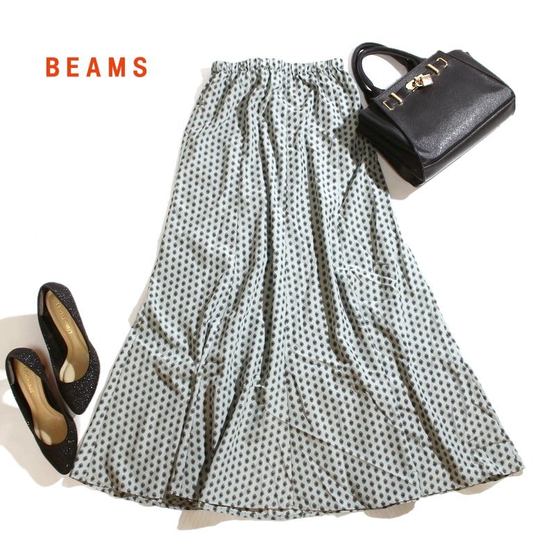 > 美品 ビームス BEAMS heart 春 夏 ほんのり艶 エスニック ドット フラワー プリント ロングスカート くすみ グレー 水色 ウエストゴム