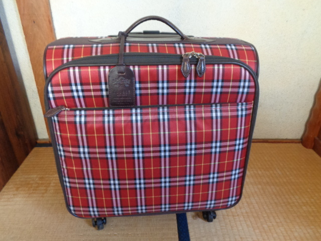 - PUJOLS/キャリーケース・スーツケース/小型トラベルバッグ/四輪/布張り・赤チェック柄/鍵付き・セカンドポーチ付き/コマに割れ欠けあり/
