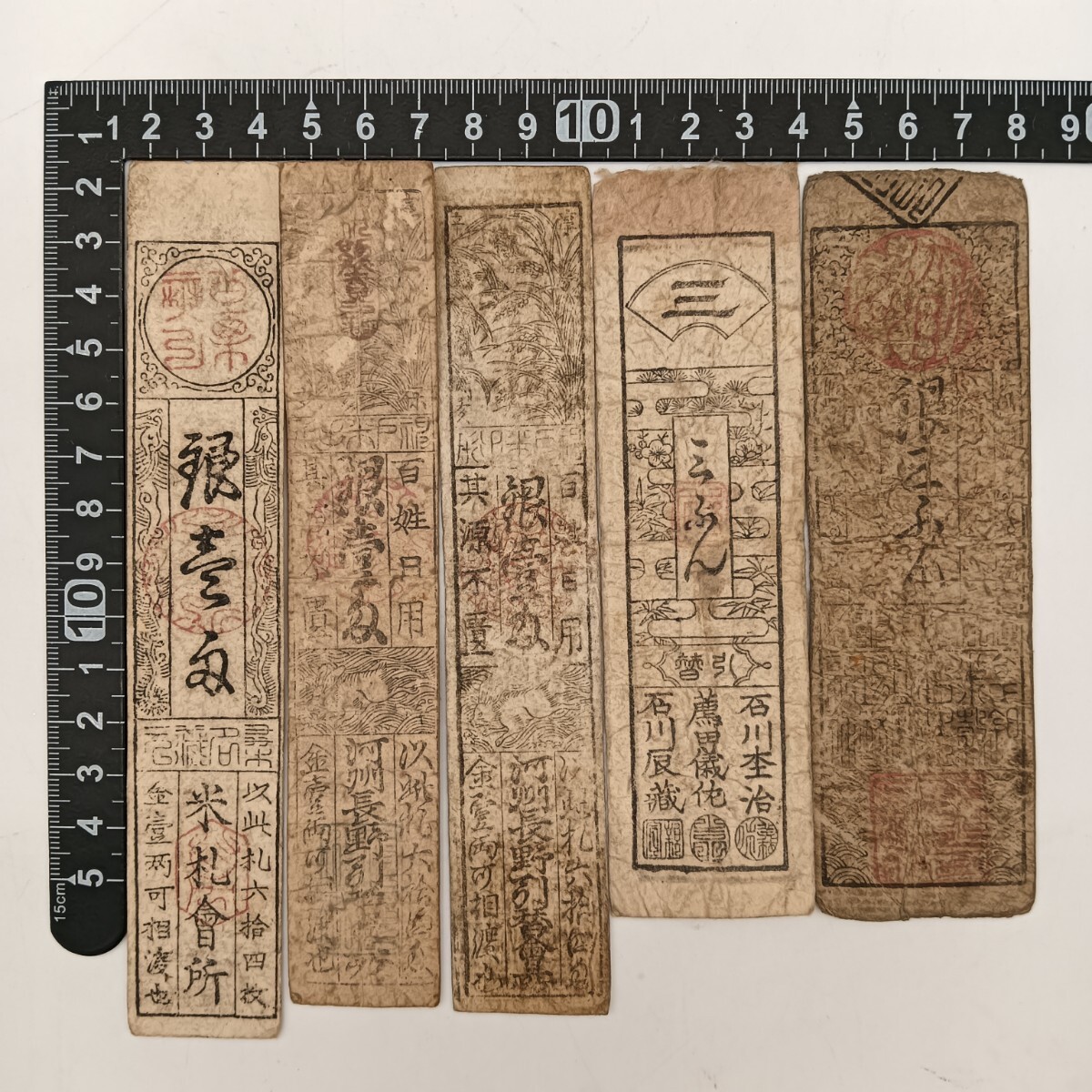 - 【A3524】江戸〜明治時代 古札 藩札 私札 朱印 貨幣 古紙幣 古文書 骨董品 アンティーク 5枚まとめ
