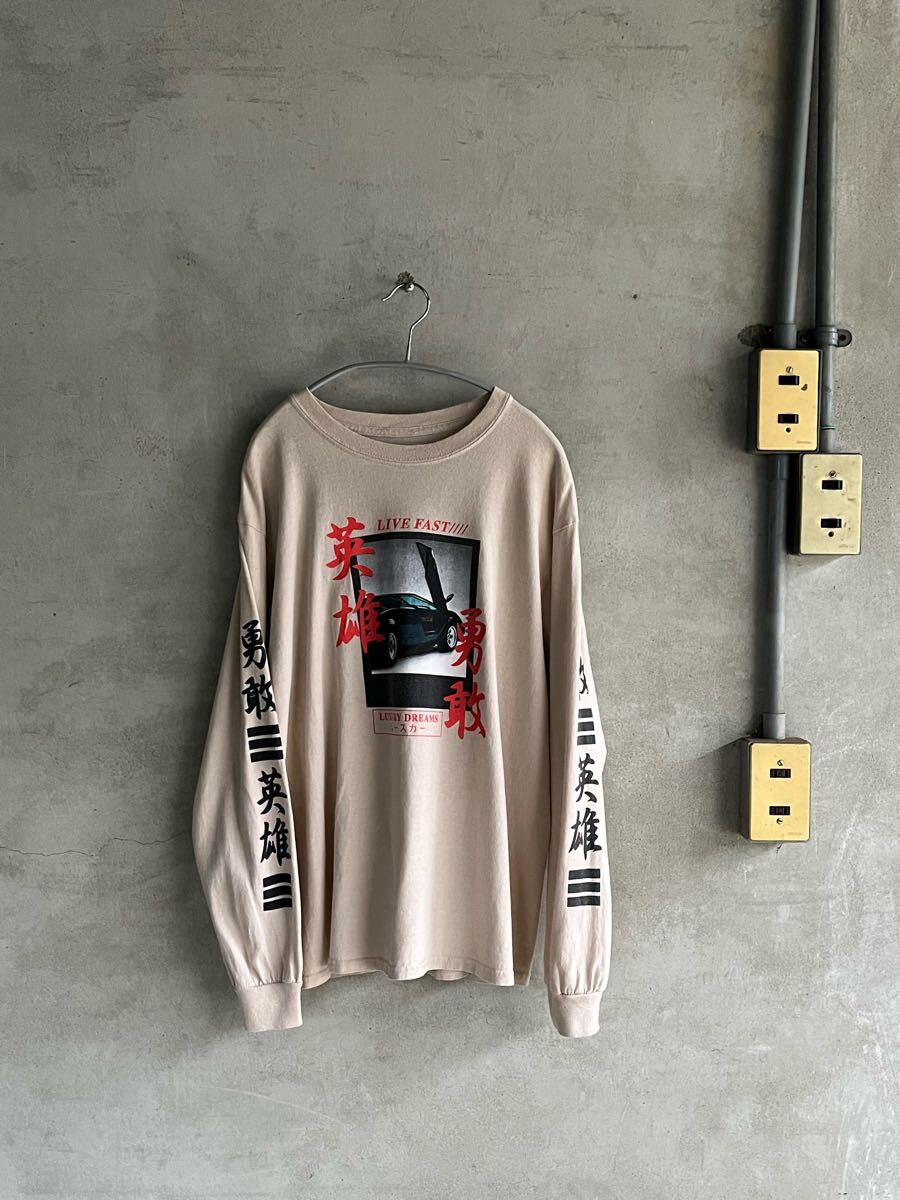- 00s 2000年代 漢字 プリント 長袖 Tシャツ ロンT y2k y3k レーシング 英雄 Japan スポーツカー パロディ ロングスリーブ ビンテージ 古着