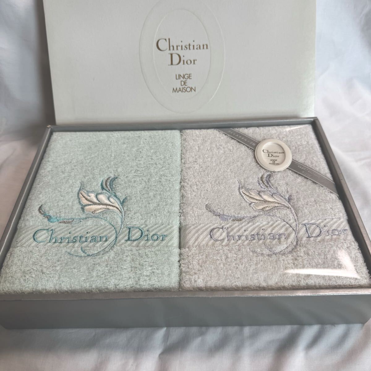 - Christian Dior フェイスタオル 綿100 ホワイト 水色 2枚セット 箱付き 未使用 クリスチャンディオール