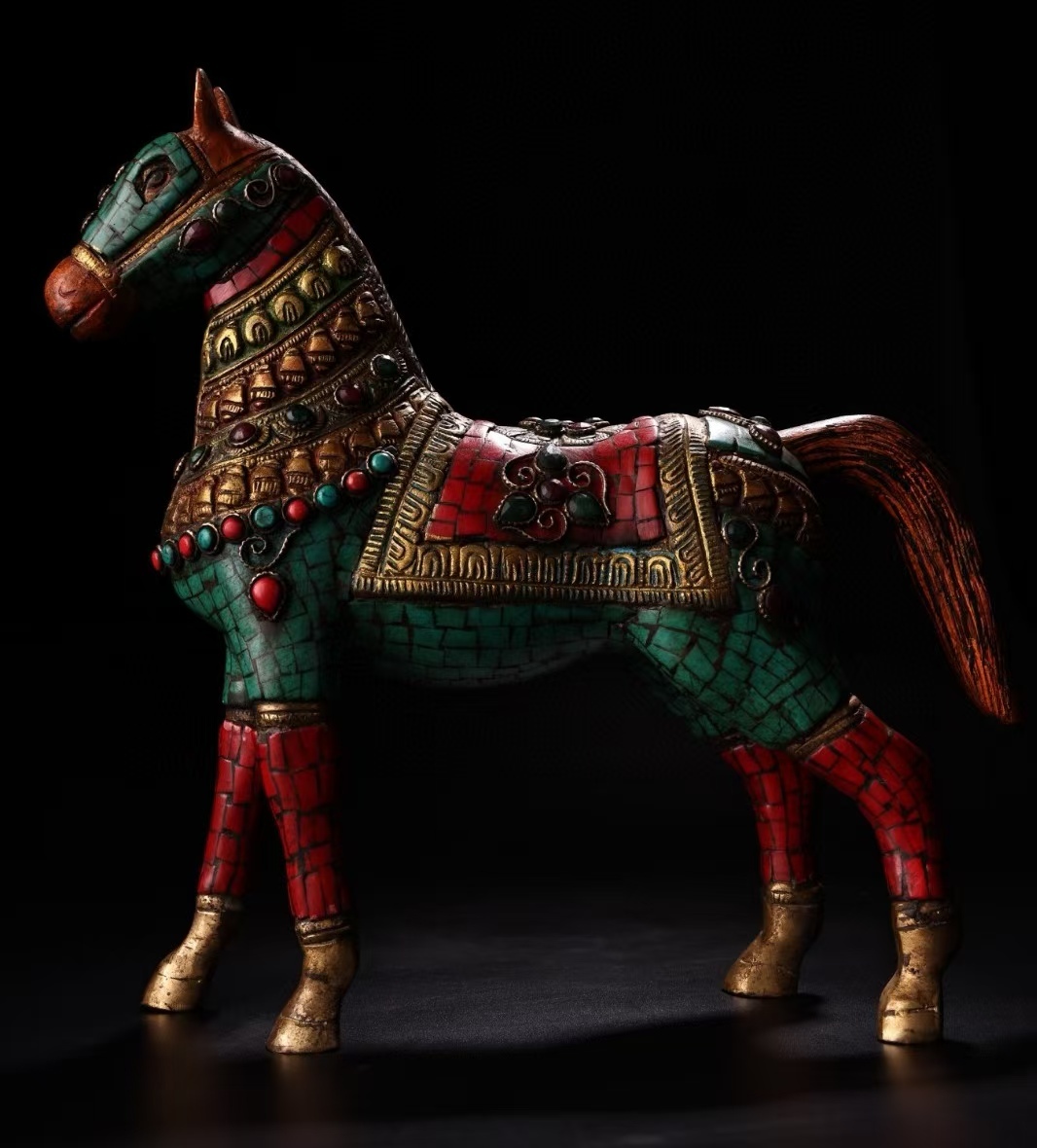 > 清代 旧蔵 チベット古寺 蔵伝古銅モザイク宝石彩色蒔絵戦馬 銅製 銅琉金 唐物 收蔵品 時代物 古置物 希少珍品 供養品 文房具 仏教6.26
