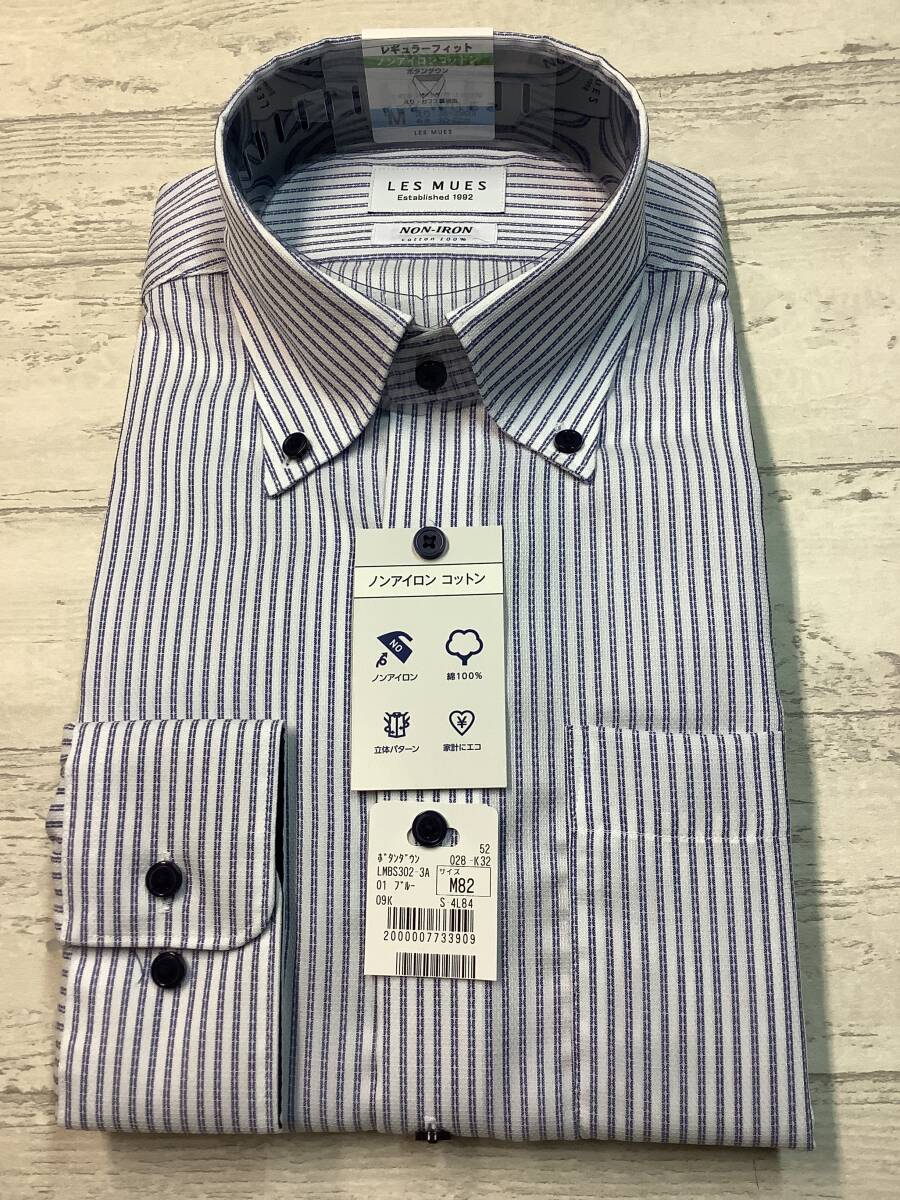 - 39-82 ★長袖Mサイズ ボタンダウンドレスシャツ ★ノンアイロンコットン 綿100% ★ブルーラインストライプ
