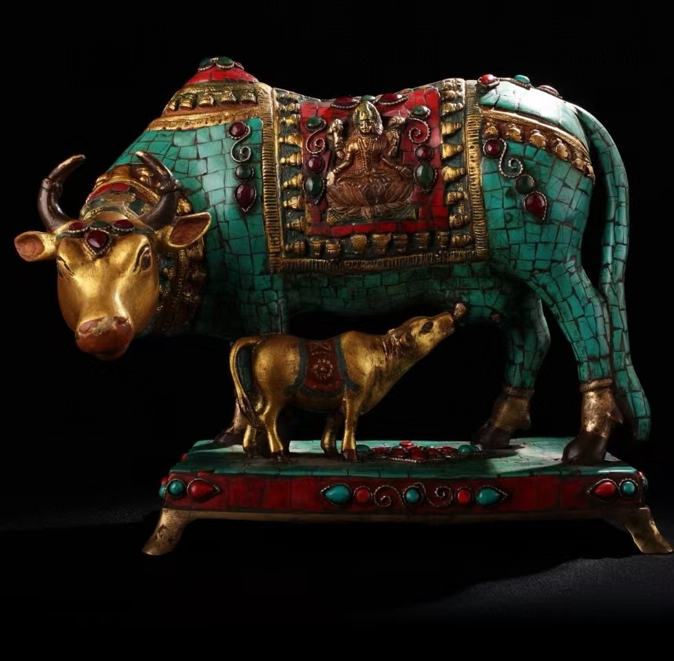 - 清代 旧蔵 チベット古寺古銅モザイク宝石彩色蒔絵金蔵伝母子牛 銅製 銅琉金 唐物 收蔵品 時代物 古置物 希少珍品 供養品 文房具 仏教6.26