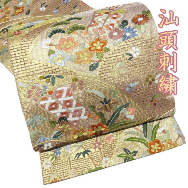 - 袋帯 中古 リサイクル 正絹 フォーマル 仕立て上がり 六通 汕頭刺繍 スワトウ 地紙に花の図 箔糸 多色 金 きもの北條 A1221-17