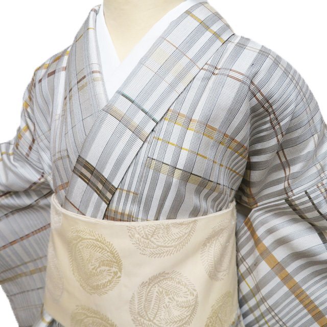 > 特選 小紋 着物 中古 正絹 袷 カジュアル 格子模様 灰白色 黒色 多色 身丈158cm 裄65cm M きもの北條 A1221-3