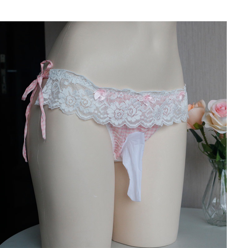 - ★ピンク白チェック柄 フリフリレースセクシー下着カフスバッグ紐ブリーフビキニ★9003