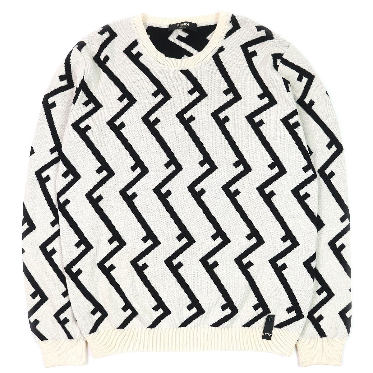 > 極美品△FENDI フェンディ FZZ489 ウール100% FFモチーフ 総柄 クルーネック 長袖 ニット セーター アイボリー ブラック 54 伊製 正規品