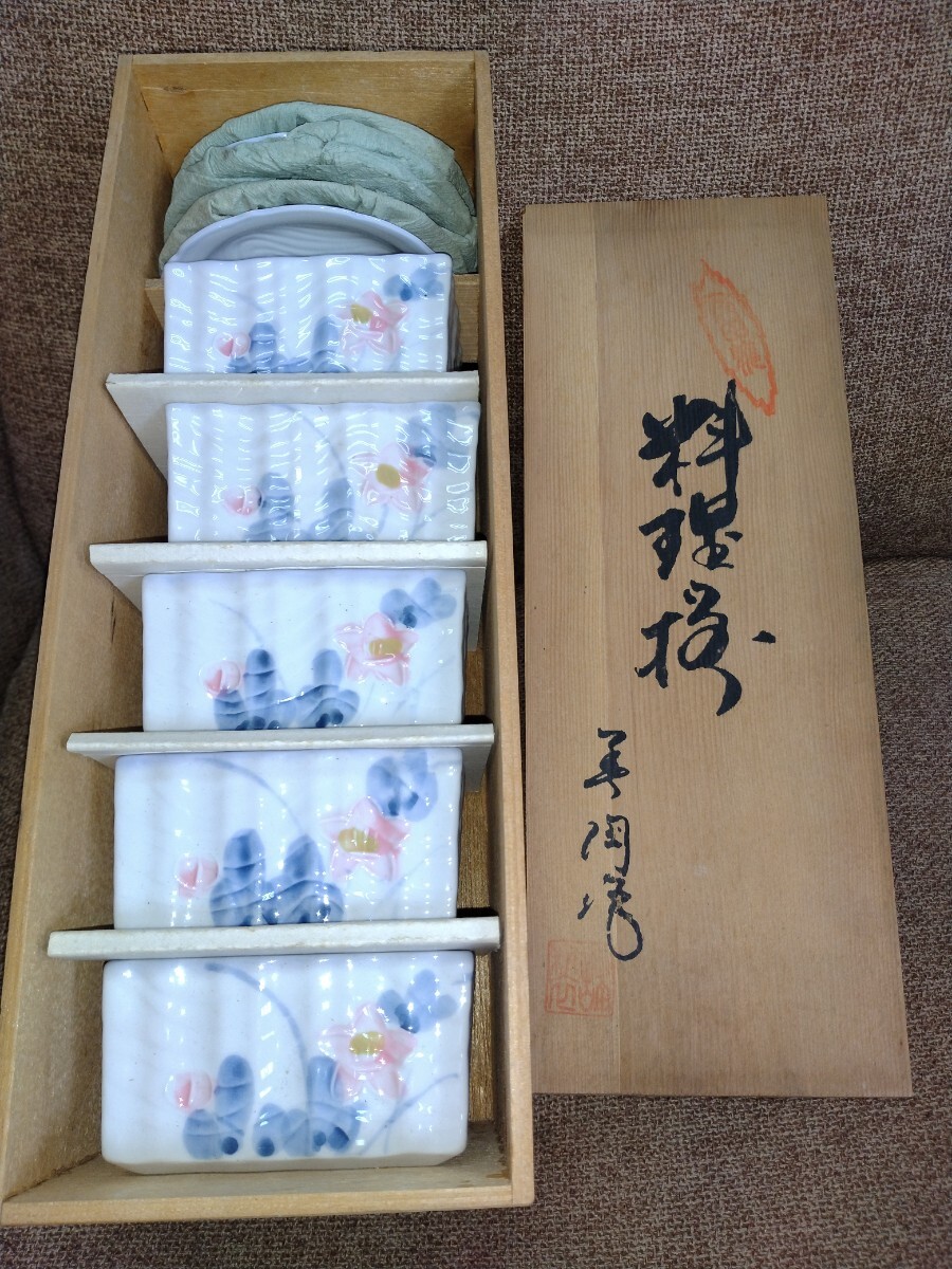 - K181【未使用/保管品】 有田焼 美陶 春花 料理揃 小鉢 小皿 5客揃 和食器 うつわ 器 木箱