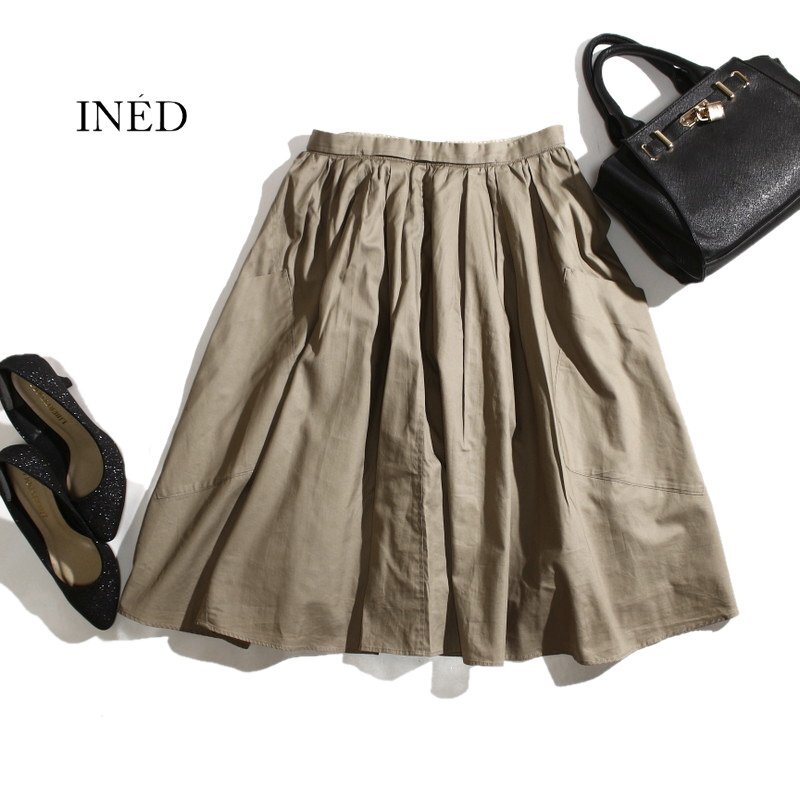 > 美品 イネド INED 株) フランドル 春 夏 コットン ポリエステル シャツ生地 ギャザー フレアスカート 9号 ベージュ カーキ オフィス 通勤