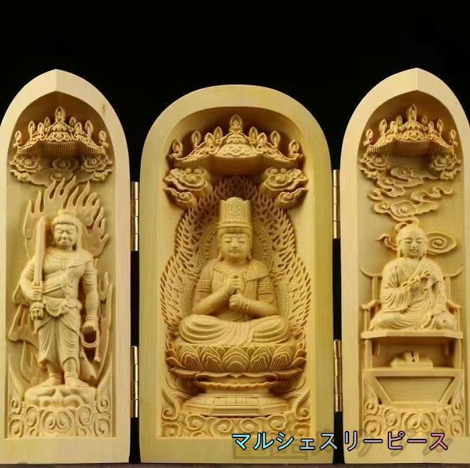 - 木彫り 真言宗 三尊 不動明王 大日如来 弘法大師 ミニ型仏龕