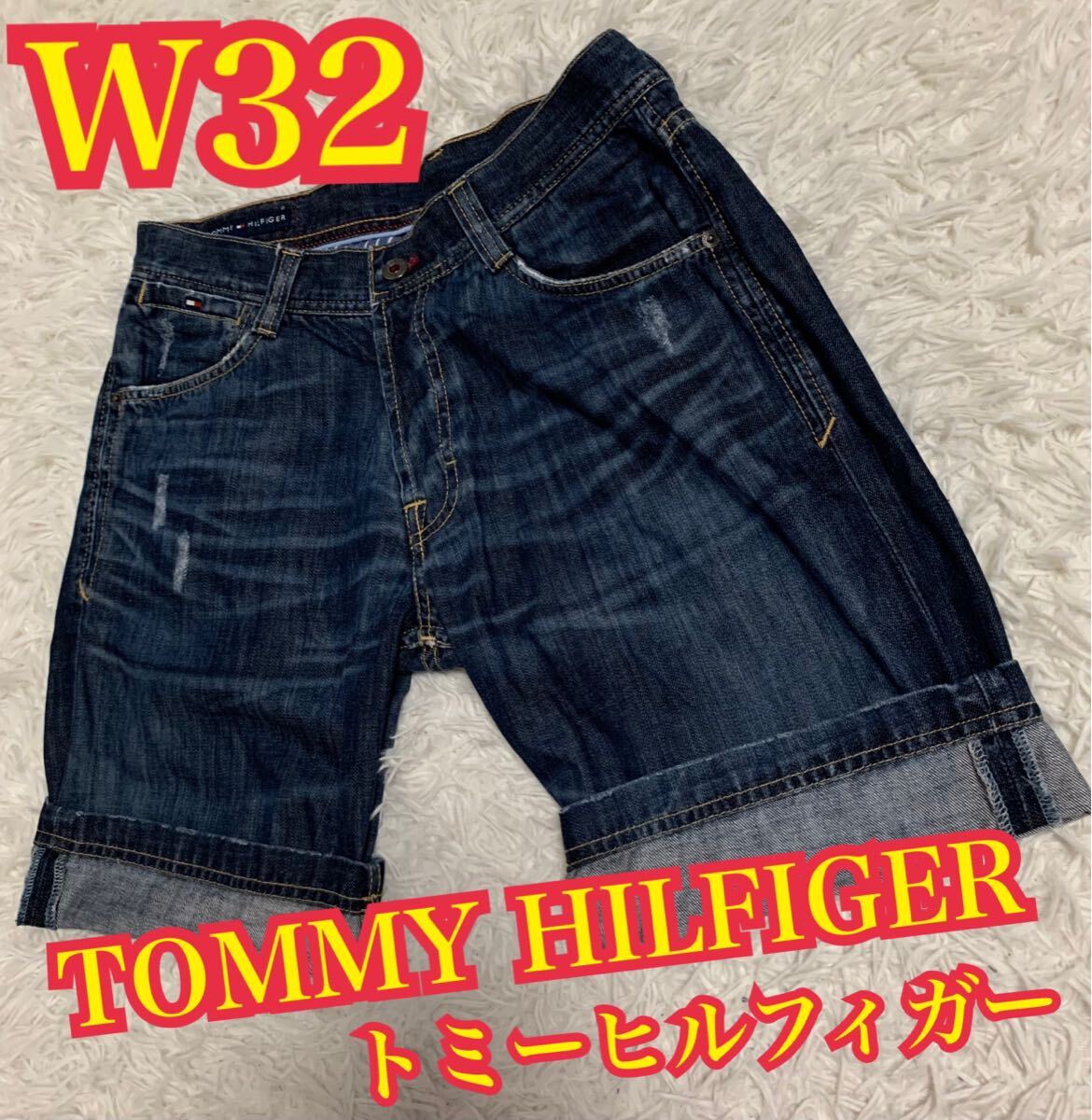 - TOMMY HILFIGER トミーヒルフィガー ハーフデニム ジーンズ レギュラーフィット インディゴ ダメージ W32