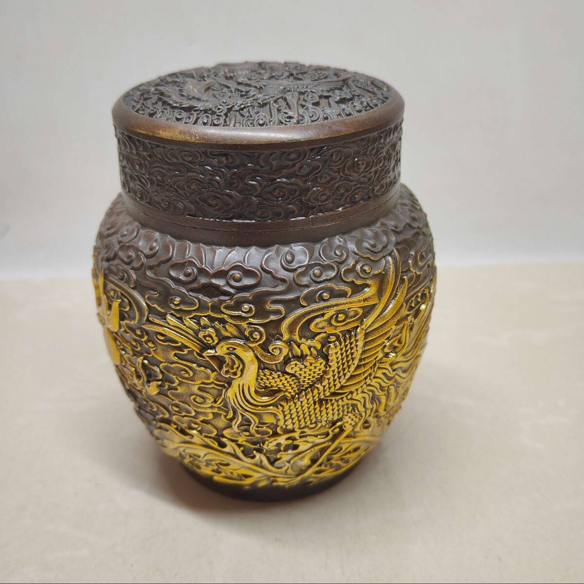 - 蔵友旧蔵出 黄銅製 塗金 龍鳳呈祥 茶葉罐 希少珍品 貴重品 置物 古賞物 中国古玩 中国古美術品