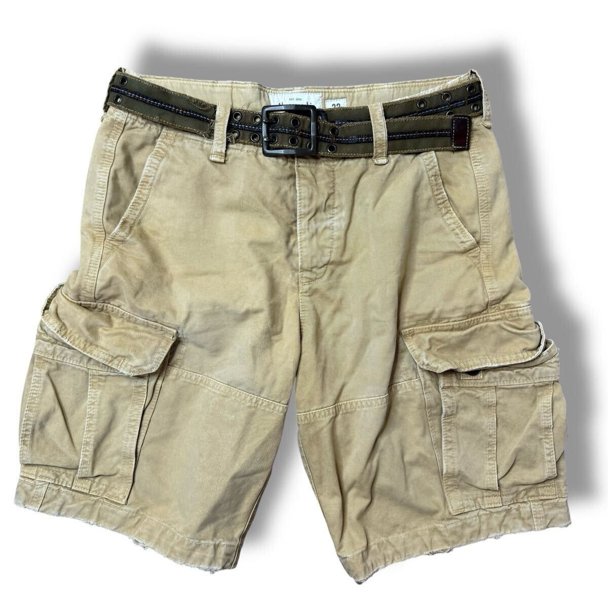 > 即決★abercombie&fitch★アバクロ 32 カーゴハーフパンツ ベルト付き ダメージ加工 ベージュ y2k