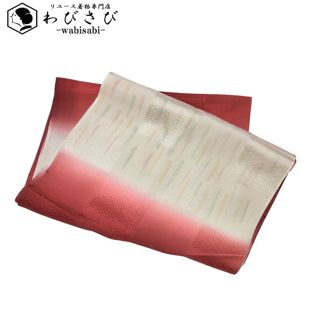 > 和装小物 帯揚げ 正絹 綸子 横縞模様に市松模様 臙脂色 C-6039 着物 きもの kimono 和服 和装 中古 リサイクル着物 【送料無料】