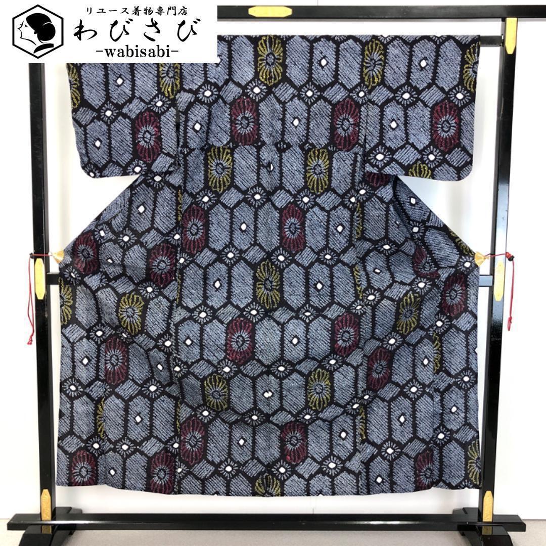 青褐色のお色味に六角形に花火の様な柄がデザインされた素敵な柄裄のお品でございます。