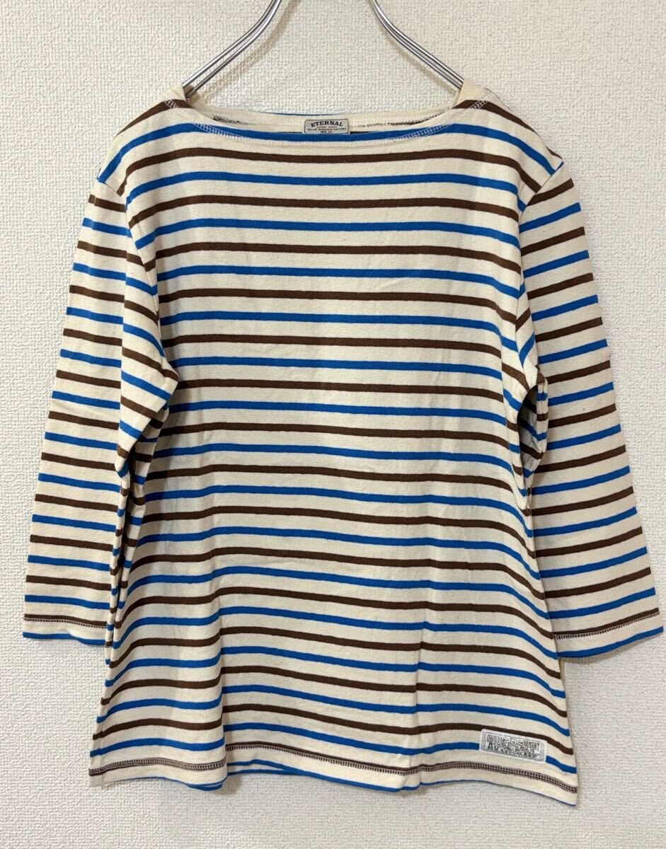 > ETERNAL 備中倉敷工房 ボーダー ボートネック Tシャツ 青 茶 ブルー ブラウン ホワイト バスクシャツ アメカジ 古着 日本製 Mサイズ 0628