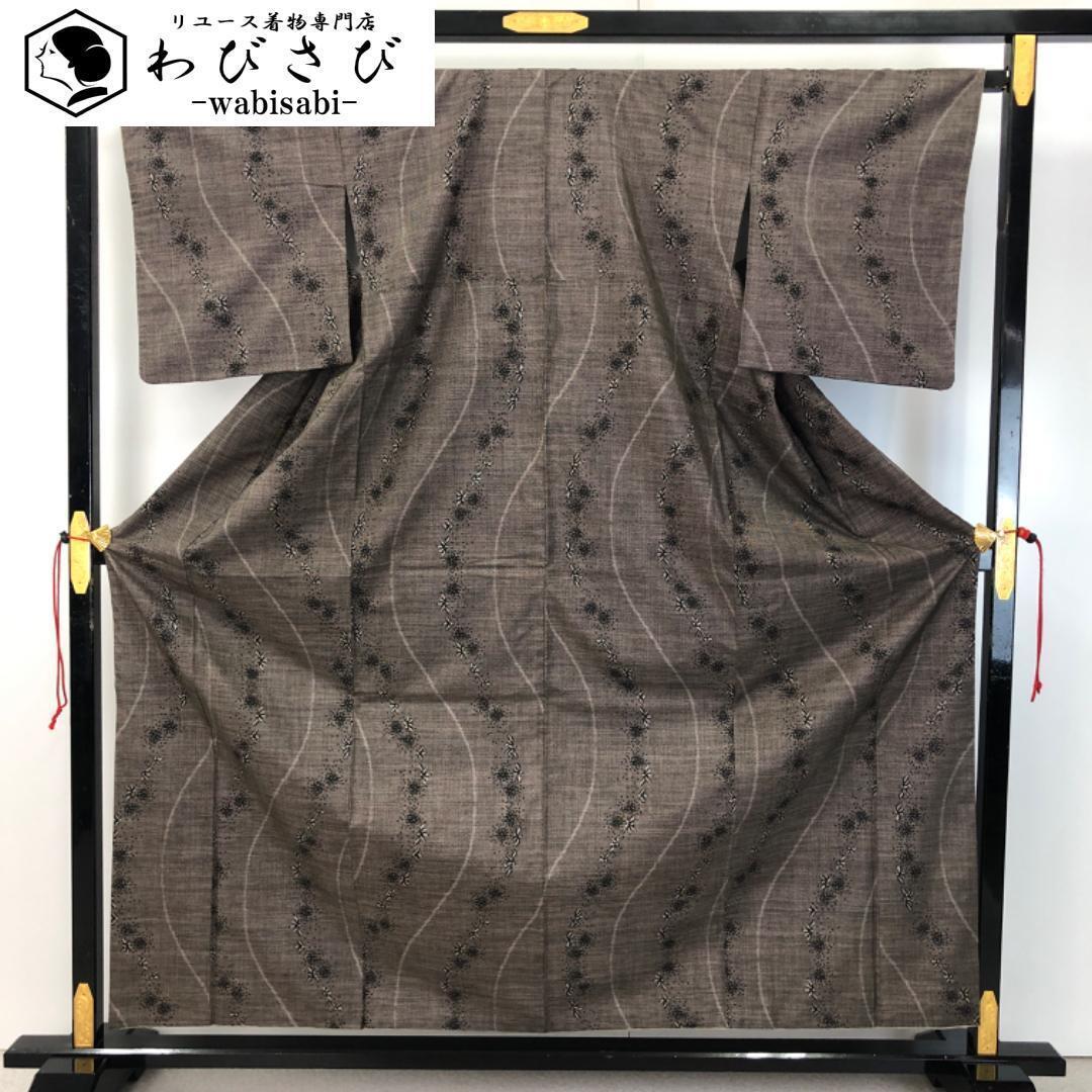 - 本場大島紬 証紙付 茶泥染 一元7マルキ 曲線花模様 K-5021 着物 きもの kimono 和服 和装 中古 リサイクル着物 【送料無料】