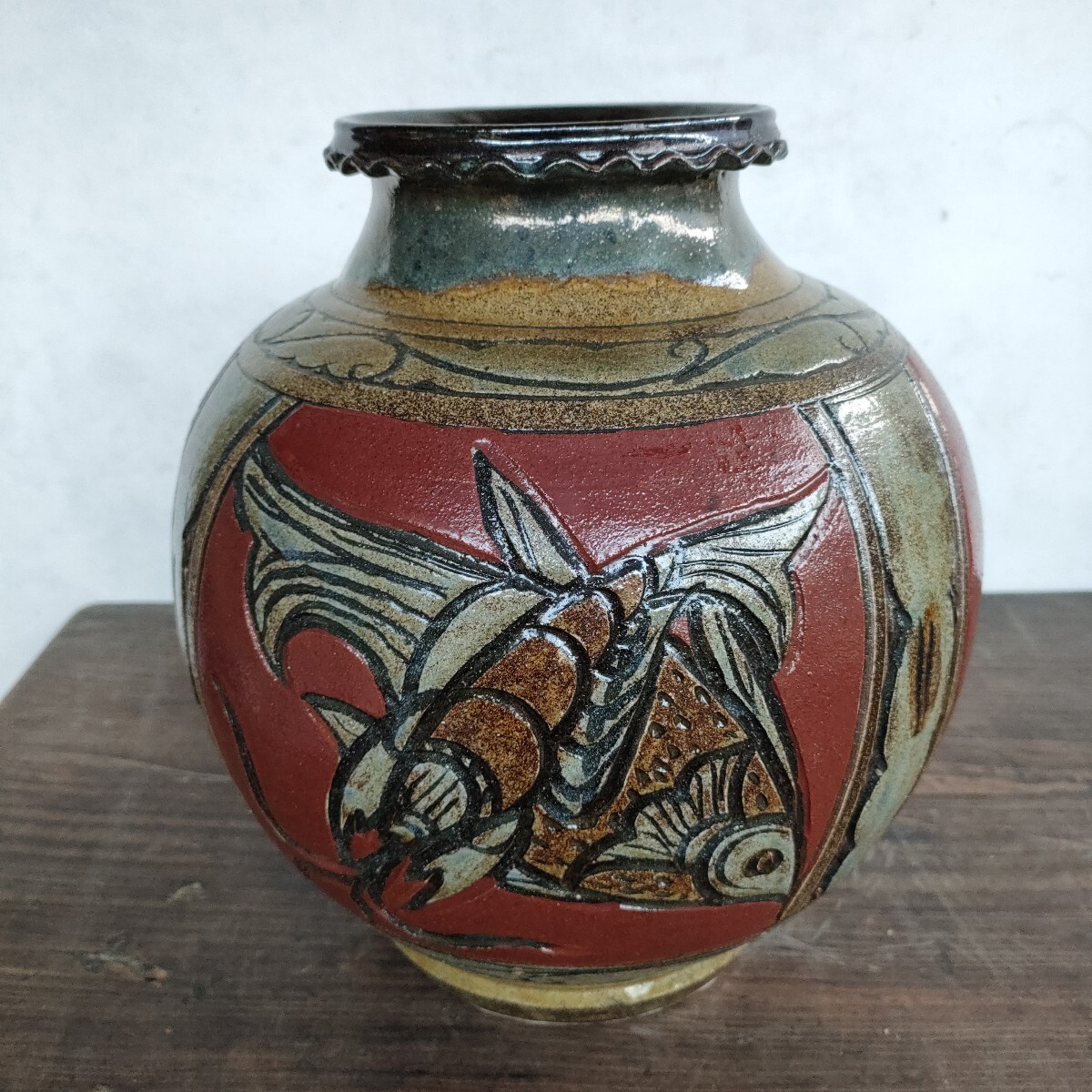 - 【壺屋焼名工 小橋川清正 作】海老魚紋 高さ28.5cm×径25.5cm 銘あり 重さ3.9kg 沖縄 赤絵 大花瓶壺琉球送料込無料伝統工芸 美品 花入花器