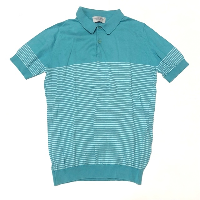 > ☆二点落札で送料無料!2A42【美品】JOHN SMEDLEY 英国製 シーアイランドコットン 最高級 半袖 ポロシャツ メンズ S ボーダー ターコイズ系