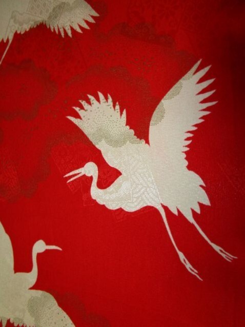 - F-21★赤地*鶴*飛鶴*雲取り*人絹*古布はぎれ★アンティーク/一閑張り/文化人形