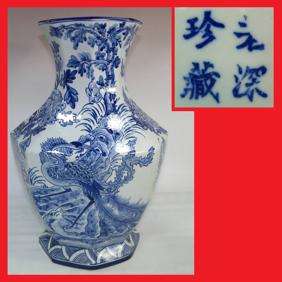 - ゆうパック.120サイズ送料記載み 若深珍蔵 8角形花瓶 鳳凰?花? 飾り.花瓶 H/43㎝位・直径/28.5㎝位 見栄えする花器(赤枠.樂多我)