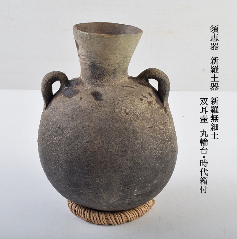 - 朝鮮美術 須恵器 新羅土器 新羅無細土 双耳壷 丸輪台・時代箱付 MLPC