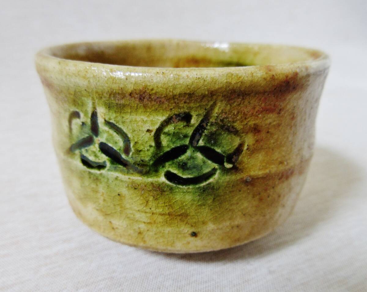- 黄瀬戸織部タンパン花文ぐい呑み【4代加藤作助】愛知県無形文化財保持者 陶印薄い 箱無し