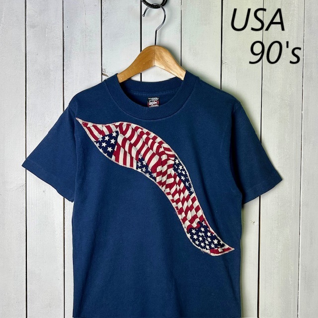 > T●418 USA古着 90s USA製 アメリカ星条旗パッチワーク Tシャツ 14-16 紺 オールド ヴィンテージ バンダナ シングルステッチ ユース チビT