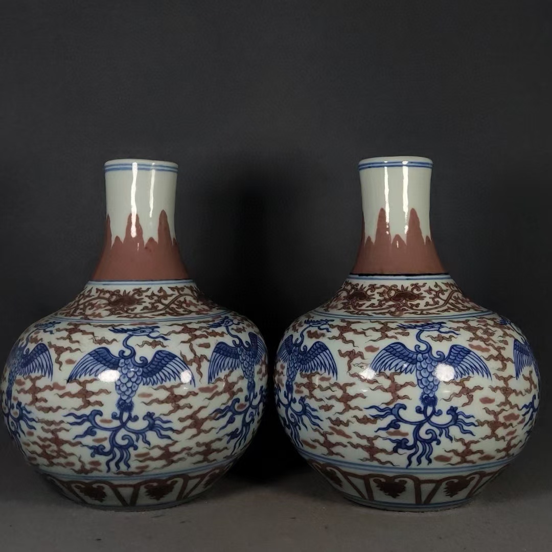 > 磁器 花瓶 秘藏 大明万暦年制 青花釉に赤鳳凰紋の天球瓶 酒器 茶器 唐磁 染付 陶磁器 收蔵品 時代物 古美術 古置物 希少珍品 中國文玩7.3