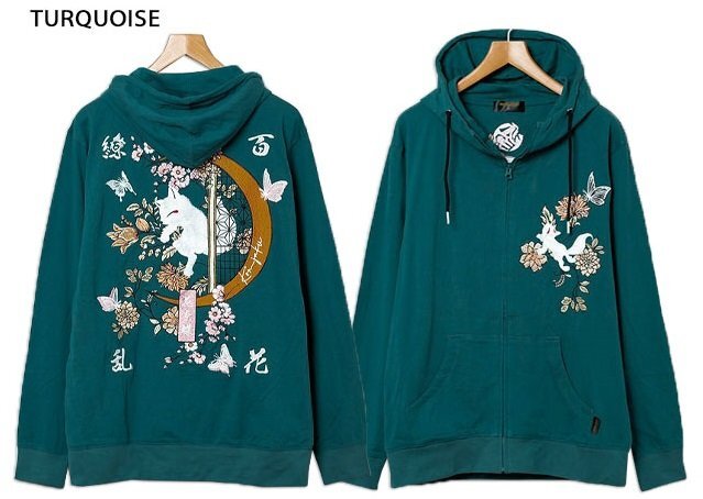 - 百花繚乱天竺ジップパーカー◆今昔 ターコイズ Lサイズ KJ-29246 和柄 和風 狐 きつね キツネ 刺繍 こんじゃく