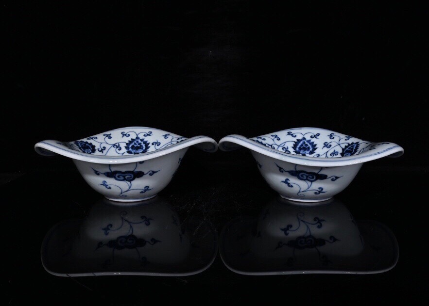 > 『館蔵珍品 明 宣德年製款 古陶瓷品 青花 纏枝花紋 帽沿碗一對 陶藝』稀少珍蔵品 古賞物 貴重物品 収蔵品 中国古美術 時代物 古董品