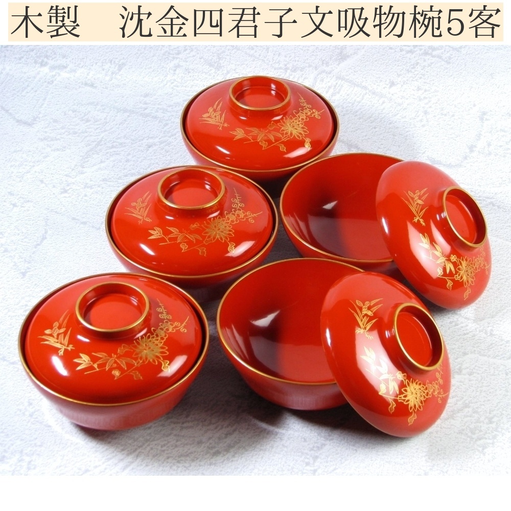 - 木製 朱漆 沈金四君子文吸物椀5客 幅:12.2cm 美品/24i012