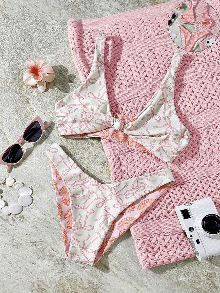 - レディース 水着 ビキニセット 夏用 レディース ビキニセット2点 リボン&貝殻 両面プリントデザイン 可逆式 調整可能ワイドスト