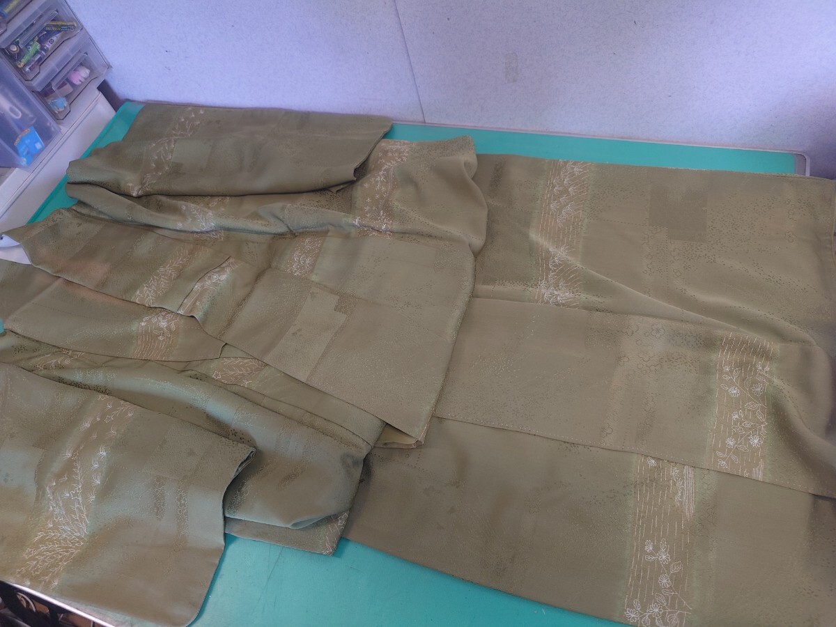 - ● 123 正絹 着物 くすみグリーン 鶯色 小花 梅 桔梗 撫子 萩 笹 薄 リメイク 中古 ③