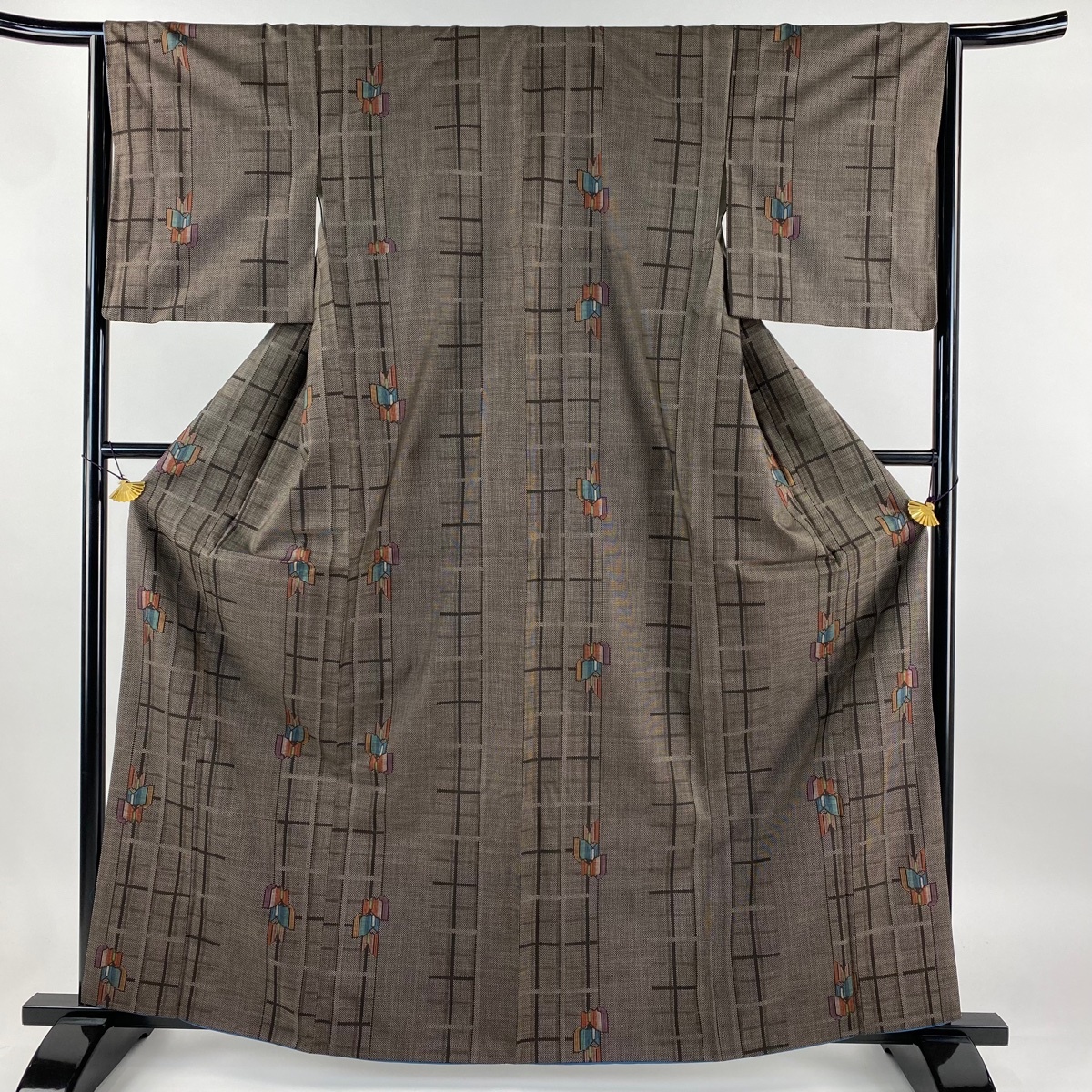 - 紬 身丈162.5cm 裄丈65cm M 袷 幾何学 焦茶色 正絹 美品 秀品 【中古】