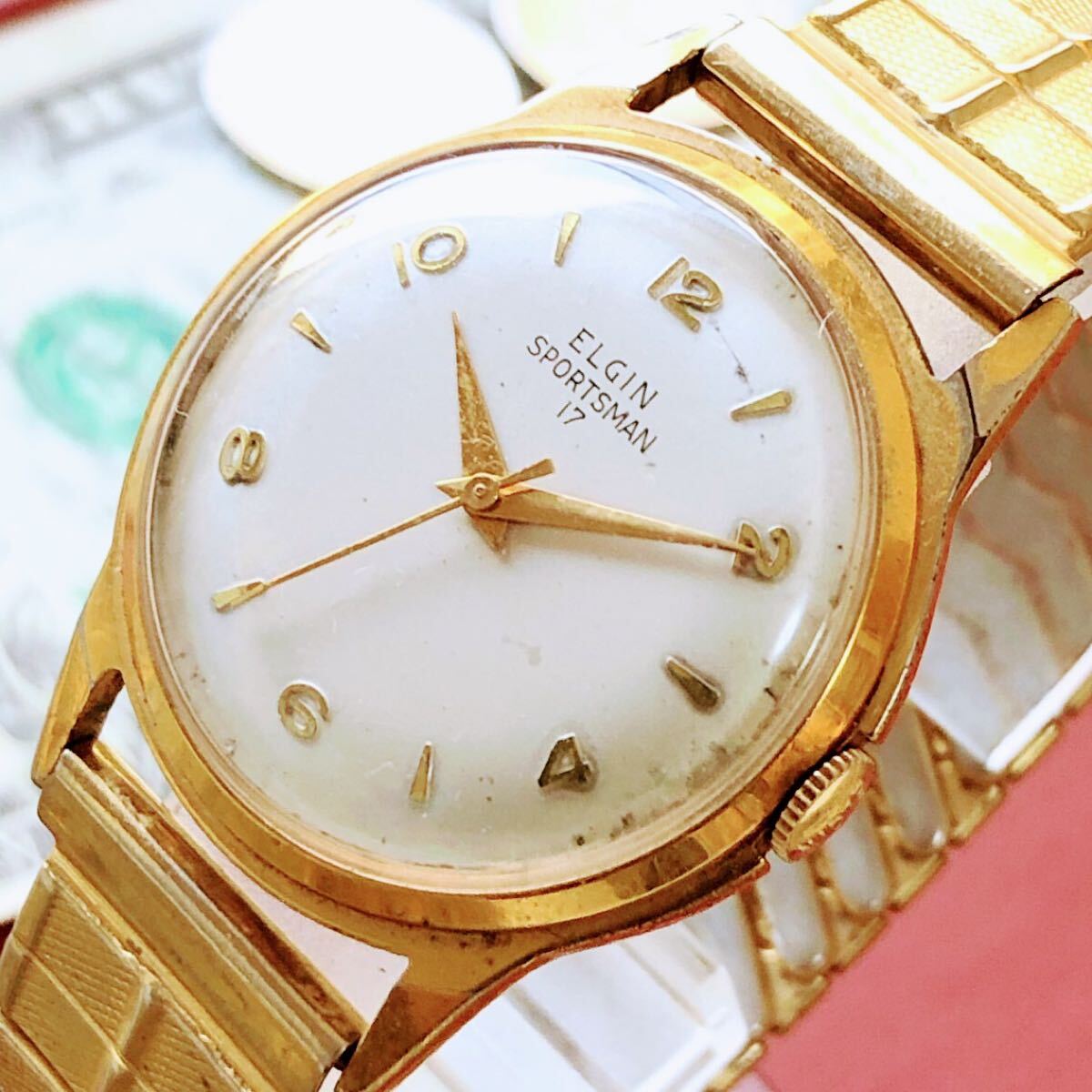 > #3677【シックでお洒落】メンズ 腕時計 エルジン 動作品 手巻 ELGIN 金張り アンティーク ヴィンテージ SPORTMAN 機械式 1950年代 ゴールド