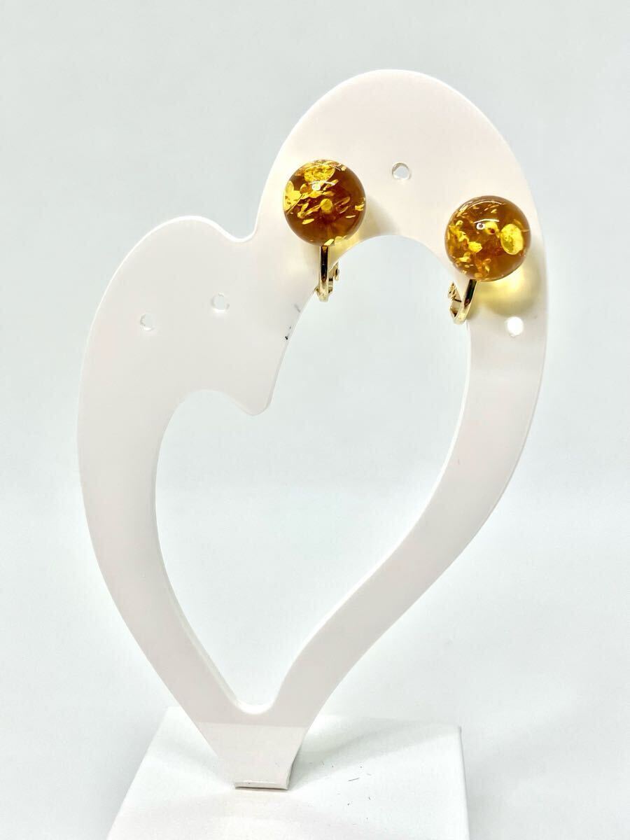 > 【新品、未使用】リトアニア産琥珀イヤリング*コハク*こはく*アンバー*ネジバネ式*くっつきタイプデザイン*シンプル*真円*9㎜玉