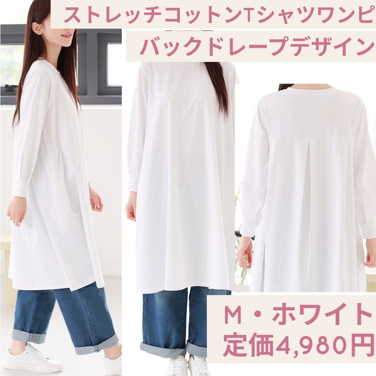 - 定価4,980円 M ホワイト Sleeping Sheep スリーピング シープ ストレッチコットン 長袖 後ろドレープ レディース ロング Tシャツワンピース