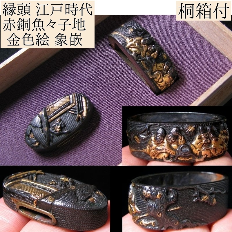 - 時代武具 縁頭 赤銅魚々子地金色絵 象嵌 桐箱付 江戸時代/21f064