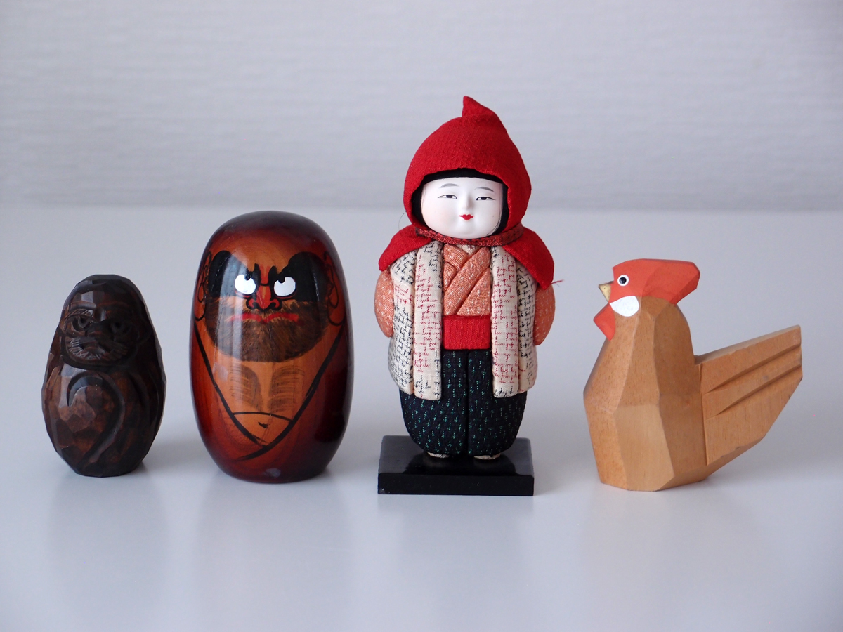 - ●民芸品 達磨大師 + 木目込み人形 + 一刀彫 鶏 セット●まとめ だるま 日本人形 雪ん子
