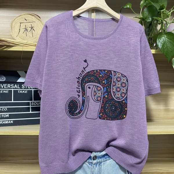- 25zy サマーニット レディース トップス 高質 ラフ 麻タッチニット チュニック ナチュラル 麻混 サラサラ 涼感 クールネック プリント柄1