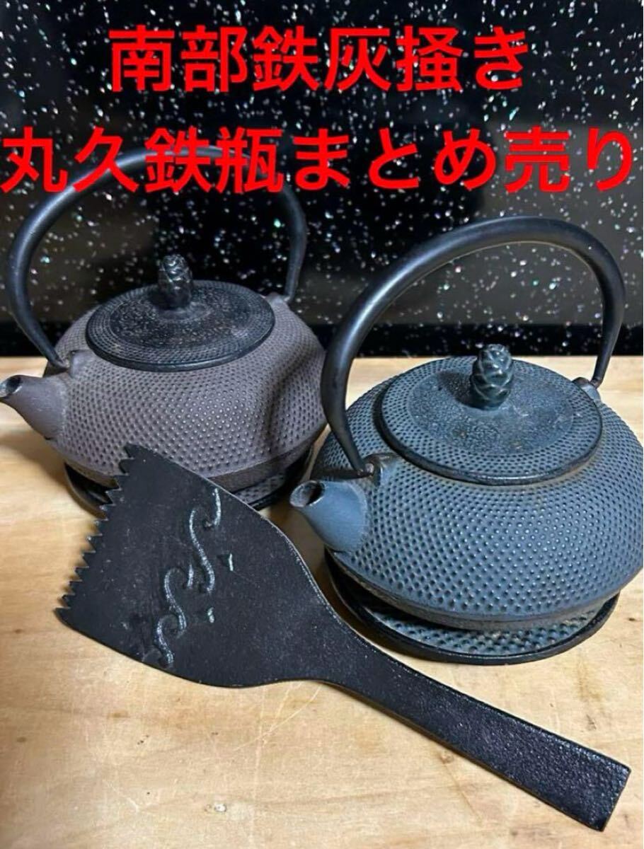 - 南部鉄灰掻き、丸久鉄瓶2つまとめ売り 南部鉄器 鉄瓶 茶器 鉄器 骨董品 急須 茶道具 アンティーク
