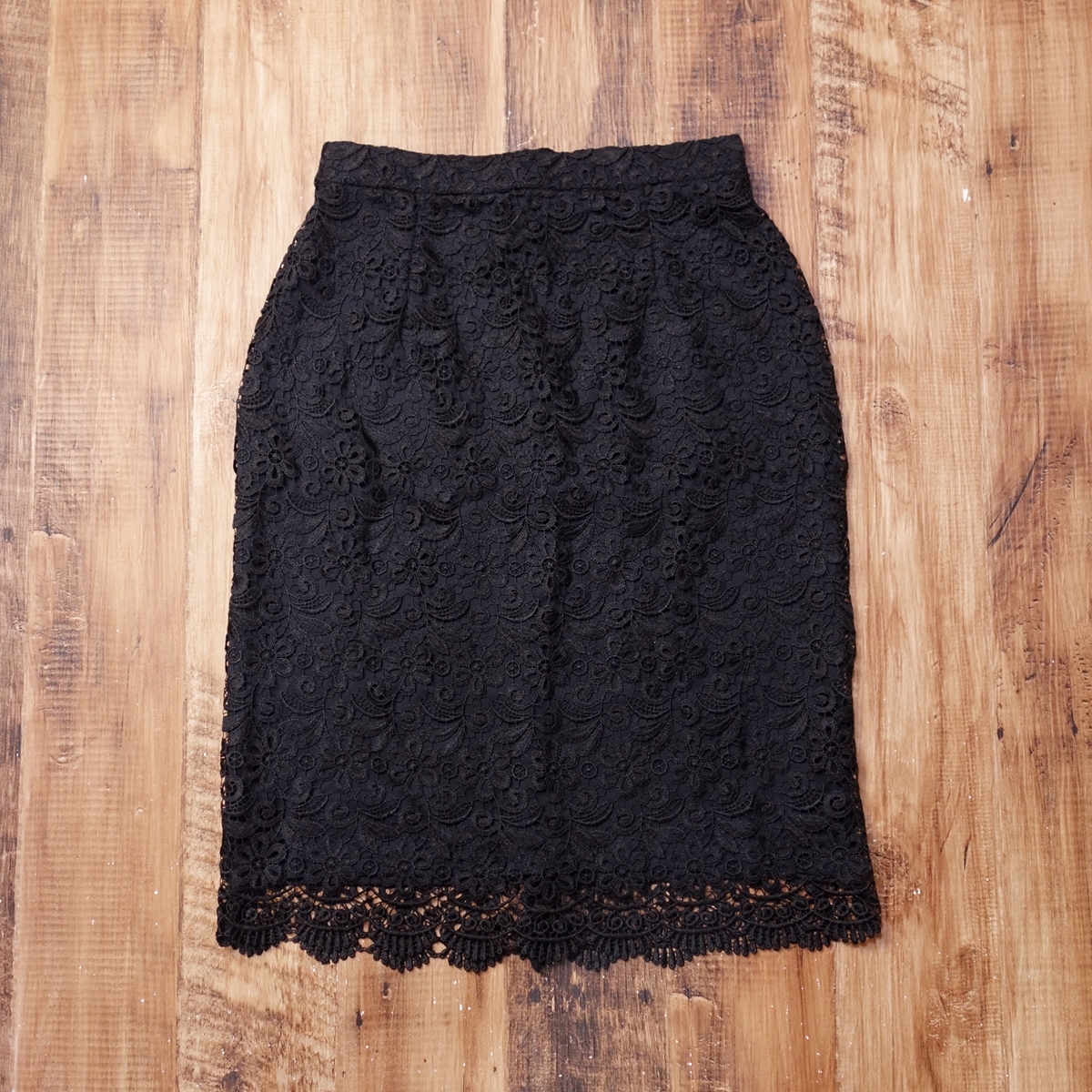 > 美品 ユニクロ UNIQLO レースタイトスカート レディース 花柄 ペンシル 膝丈 Mサイズ 黒 LA17