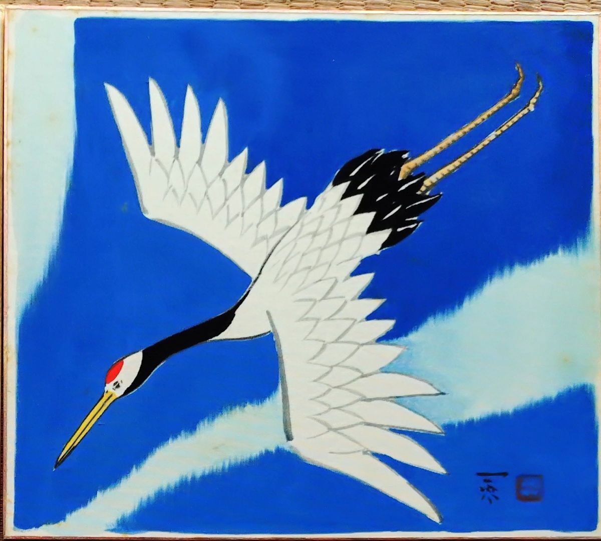 - f25071051〇直筆肉筆画 色紙 鶴 秋元清大画伯 解説付 昭和46年〇和本古書古文書